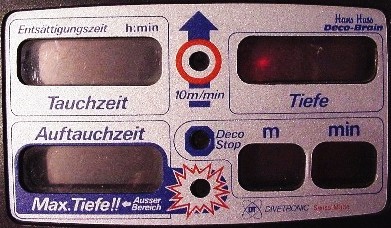 Das »Dekobrain« berücksichtigte nicht nur JoJo-Tauchgänge, sondern zeigte parallel auch immer die Dekostufen und Dekozeit bis zur völligen Entsättigung an. Zunächst (Decobrain I) wurden nur die Deko-Werte aus Tabellen interpoliert (5 schweizer Tabellen von 0 bis 3500m Höhe) . Diese Interpolation ermöglichte aber die Verarbeitung von Wiederholungstauchgängen. |
