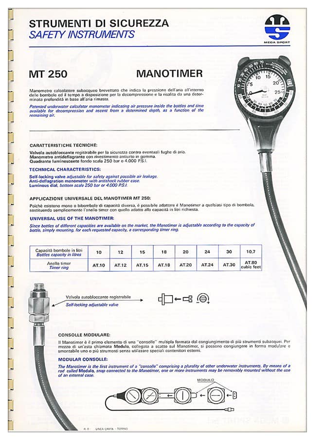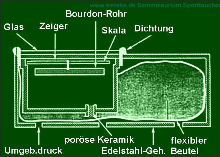 des späteren Dekometer vorweg und war mit zwei Geweben sogar besser. Dann kam 1958 das Dekometer von SOS, konstruiert von Carlo Alinari nach einer Idee des Unterwasser-Filmers Vittorio de Sanctis. Es arbeitete prinzipiell ähnlich wie der Mark I von Foxboro, aber in der Realisierung anders. Es verwendete nur ein Gewebe (Halbwertzeit 120min) und eine einzige Blase statt der 5 Faltenbälge des Foxboro. Es wurde wegen seiner Einfachheit und Zuverlässigkeit in verschiedenen Ausführungen die nächsten Jahre sehr verbreitet eingesetzt (Distribution über viele verschiedene Marken). Die Nutzbarkeit für tiefe und Wiederholungstauchgänge war aber wohl sehr umstritten, siehe 'DKM unter Druck' weiter unten. 1963 berichtete man auch in der DDR davon: |