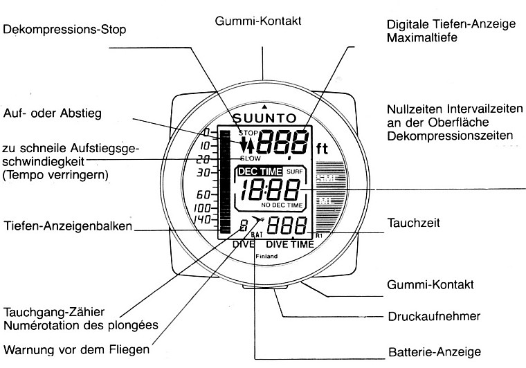 ausgereiften und preiswerten TC, Suunto mit dem SME-ML. Er berechnet 9 Gewebe mit Halbwertszeiten von 2,5 bis 480 min und orientiert sich an den USNavy-Tabellen. Die empfohlene Aufstiegsgeschwindigkeit ist 10m/min. Der SME-ML (ML steht für MultiLevel) hatte erstmals einen Profilspeicher für die Tauchgänge, 1 Tupel alle 3 min, Gesamtkapazität 10 h. Sein kräftiges Metallgehäuse (schön ist, was funktioniert!) ist relativ klein und wiegt etwa 120g. Die 1,5-V-Batterie hält etwa 1500 h, und sie lässt sich relativ leicht selbst wechseln. Leider geht der SME-ML bei 60m in den Errormodus, und die maximale Zeit auf einer Dekostufe ist 30 min. Ich setze ihn immer noch als Zweitcomputer ein, er ist unverwüstlich. Viele Diveguides können ihn nicht bedienen ;-)) Na, und was Suunto heute macht, weiß ja jeder ! |