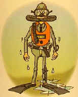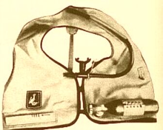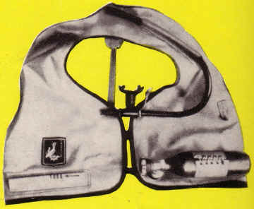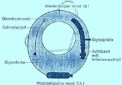 Rettungswesten für Taucher haben nicht nur die Aufgabe, den Benutzer in Notfällen wieder an die Oberfläche zu bringen, auch Austarieren ist damit in jeder Tiefe möglich. Dies ist bei dicken Neoprene-Anzügen besonders wichtig. Wenn man an der Oberfläche richtig austariert hat und dann abtaucht, so steigt die Sinkgeschwindigkeit mit zunehmender Tiefe. Das Volumen des Anzuges wird durch den Wasserdruck geringer und somit auch der Auftrieb. Bestückt man den Ballastgürtel aber so, daß man in der Tiefe richtig austariert ist, kann man sich dort gut bewegen. Werden aber zum Schluß des Tauchganges geringere Tiefen aufgesucht, so ist es unmöglich, ohne einen festen Halt in bestimmten Tiefen zu bleiben, denn inzwischen sind ja drei bis vier Kilopond Luft veratmet worden - zusätzlicher Auftrieb. Diese Probleme können mit einer Rettungsweste beseitigt werden. In jeder Tiefe ist durch Aufblasen mit dem Mund oder mit einer kleinen Preßluftflasche der gewünschte Auftrieb zu erreichen, wobei es notwendig wird, sich etwas Ballast mehr umzuhängen. Beim Auftauchen läßt man durch Betätigung des Atmungs- oder Uberdruckventils eine bestimmte Menge Luft aus der Weste. Im Notfall kann beim Aufstieg über den Schlauch die sich ausdehnende Luft geatmet werden. Das Uberdruckventil vermeidet ein Platzen der Weste beim vollständigen Aufblasen. Die Rettungsweste leistet bei Erschöpfung gute Dienste als Schwimmhilfe, da der Kopf über die Wasseröberfläche gehalten wird, eignet sich aber auch zum Bergen von Gegenständen und Mitführen von schweren Apparaturen. Zum Selbstbau kann man einen Motorradschlauch, der in einer stabilen Zeltstoffhülle eingenöht wird, benutzen. Weiterhin benötigt man eine kleine Preßluftflasche mit Anschlußteilen sowie Atmungs- und Überdruckventile. Als Bauhinweise ist nebenstehende Zeichnung zu nutzen. |