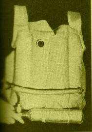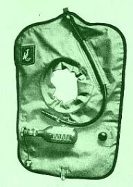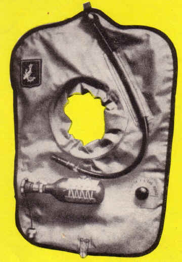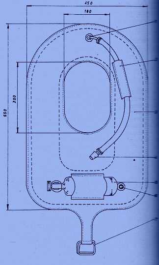 ![]() 1 - LKW-Winkelventil ohne Einsatz, aufgebohrt 2 - angenähte Schlauchhülle 3 - Motorradschlauch 3,25 X 16 (wird durch Perlonschnur oval gehalten) 4 - Mundstück mit Ventil 5 - Preßluftflasche mit Anschluß 6 - Uberdruckventil 7 - Schrittgurtschnalle |