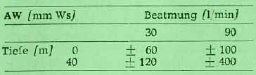 fehlenden Atemschläuche gering. Kurve 1 zeigt einen LA, dessen AW mit der Tiefe nur