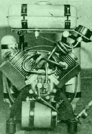 Um Gewicht zu sparen, wählte ich für den Kompressor Luftkühlung. Die erforderliche Kühlluftmenge (74 Liter/sec) wird durch einen Wartburg-Ventilatorflügel erzeugt. Da der Kompressor nur einen Achsenstumpf hat, war es notwendig, eine Verlängerungswelle mit entsprechenden Lagen anzufertigen. Auf dieser sitzen der Ventilatorflügel und die Kupplung. Das Lagergehäuse der Welle ist aus Leichtmetall gedreht und enthält zwei Kugellager, eine Wellendichtung sowie Bohrungen für Öleinlauf und -ausfluß. Das Gehäuse ist mit sechs Schrauben durch das Chassis hindurch mit dem Kompressorflansch öldicht verbunden. Entgegengesetzt der Antriebsseite sitzt am Kompressor die Ölpumpe (als geeignet erwiesen sich die Ölpumpen der EMW R 35 und der AWO, die einen Öldruck von 2,5-5 atü liefern).