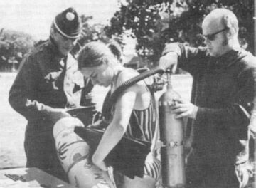 1 - Die äußere freie Behälterwand ist nur geringfügig gefährdet, wenn sie einen guten Oberflächenschutz (verzinkt, grundiert und farbbehandelt) erhält und vom Nutzer vorschriftsmäßig behandelt wird, d. h., wenn er nach einem Tauchgang das Gerät mit klarem Wasser spült und es an luftiger Stelle schnell trocknen kann. Wirksam sind diese Maßnahmen allerdings nur dann, wenn die Oberflächen nicht durch mechanische Beeinflussung (Stoß, Schlag) bereits beschädigt sind. Dazu noch ein Hinweis für "Hydromat'-Nutzer: Wenn auch die hölzerne Transportkiste das Gewicht eines Gerätes fast verdoppelt und deshalb zwei Taucher immer nur eine Kiste tragen können und wenn auch die Kiste als solche eine fragwürdige Verschwendung des Rohstoffes Holz darstellt - solange keine praktische Tragetasche zum Gerät gehört, sind die DTG in der Kiste beim Transport immer noch besser geschützt, als ohne jede Verpackung...