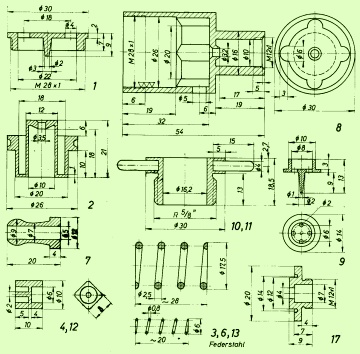 Für die Abdichtungen werden überall 0-Ringe verwendet, am Kolben z. B. ein 0-Ring 5 mit den Maßen 26 X 2 mm. Die Nut für diesen Ring muß dann 1,8 mm tief und an der Oberkante 2,3 mm breit sein. Der Flankenwinkel beträgt dann etwa 30 Grad. Bei Verwendung dünnerer 0-Ringe ergeben sich dementsprechend andere Maße. Diesen 0-Ring 5 fettet man dann mit Silikonfett ein.