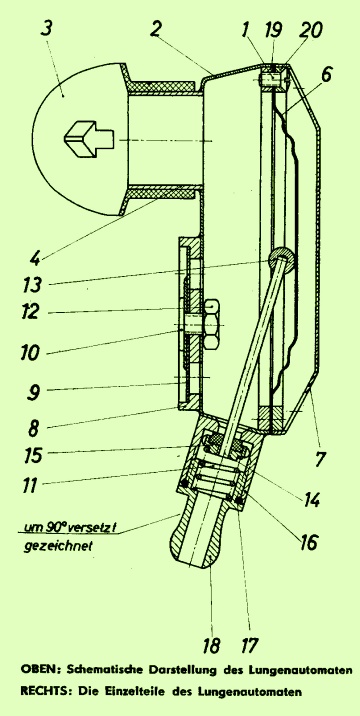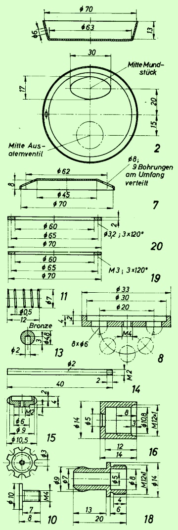Das Gehäuse der Niederdruckstufe besteht aus zwei gedrückten Ms-Schalen 2 und 7 von etwa 72 mm Durchm. In diese Schalen wurde je ein 2-mm-starker Ms-Ring 19 und 20 mit einem Innendurchmesser von 65 mm eingelötet. In den Deckelring 20 sind um 120 Grad versetzt drei Löcher von 3,2 mm Dm. gebohrt, durch die drei Ms-Linsen-Kopfschrauben (1) in den Topfring 19 eingeschraubt sind. Die Membrane 6 wird zwischen den beiden Ringen festgeklemmt. In dem Topf 2 ist 20 mm von der Mitte nach oben der Stutzen aus Rohr oder Blech (4) für das Mundstück eingelötet. 15 mm von der Mitte nach unten ist der Träger 8 für das Ausatemventil angebracht, in dessen M4-Gewinde eine Schraube (10) sitzt, die zwei Gummiplatten (9) von 29 und 20 mm Dm. festhält und von innen durch die Mutter 12 abgekontert ist. Der Schlauchstutzen 18 wird durch einen 0-Ring 12 X 1,5 gegen Teil 16 abgedichtet, welches an der anderen Seite am Topf angelötet ist. In diesem Teil 16 befindet sich das Ventilstück 15, das durch die Bronzefeder 11 gegen den glatten Sitz an der Bohrung leicht angedrückt wird. Gedichtet wird das Ventilstück mit dem Sitz durch einen fest eingeklebten weichen Gummi, der durch das Einschrauben des Ventilstiftes 14 noch auseinandergedrückt wird. Der Ventilstift 14 ragt schräg in den Topf hinein und endet in einer Kugel 12 aus Vinidur oder Ms (angeklebt bzw. angelötet), die genau unter dem Zentrum der Membrane liegt. Ventilsitz und Stift müssen so exakt gearbeitet sein, daß sich bei eventuellem Verdrehen des Ventiltellers die Stellung des Ventilstiftes zur Membrane nicht verändert.