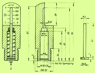 Zur Skizze: Am Hauptstück wird nach der Dreharbeit von oben her genau die Hälfte des Durchmessers 28mm lang abgefräst. Die am Kolben eingezeichnete Nut (eine Bohrung erfüllt den gleichen Zweck) dient dazu, daß im Interesse einer genauen Anzeige der Luftdruck bis zum Simmering gelangen kann. Auslenkende Kraft ist der Druck, der auf die Bodenfläche des 3-mm-starken Kolbens wirkt. Die Feder muß bei einem Viertel des Hubs einen Gegendruck von etwa 3,5 kp haben. Das entspricht dann dem Anzeigewert von 50 atü. Demnach bei halben Hub 7 kp (100 atü) und bei vollausgedrücktem Kolben (200 atü) etwa 14 kp. Kolben und Feder sind vor Inbetriebnahme mit Silikonfett einzuschmieren.