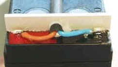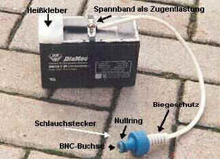 um dem abschließenden Heißkleber seine Form zu geben. Die Kabel werden mit Kabelbindern oder Edelstahl-Schlauchspannern um den Akku zugentlastet, damit die Kontaktstellen weitgehend kraftfrei bleiben. |