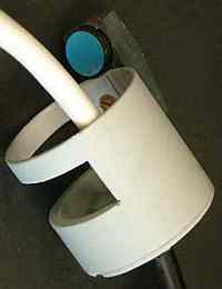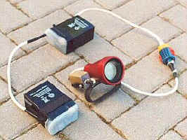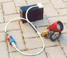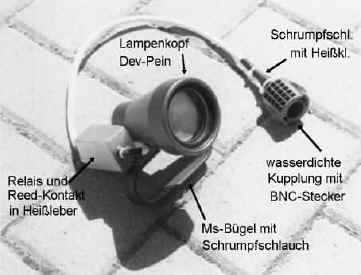 oder spot (15°) bis 75W im Baumarkt oder bei CONRAD gibt. Gut bewährt hat sich ein Lampenkopf von DevPein aus eloxiertem Aluminium, der mit Glas, Strahler-Fassung und Kabeldurchführung geliefert wird (etwa 140DM). Da schraube ich einen Ms-Bügel (Baumarkt) als Goodman Handle und einen Schalter dran, der aus einem REED-Kontakt und einem gekapselten 12-V-Relais besteht, die in Heißkleber vergossen sind. Den Magneten dazu