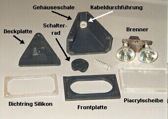 aus PE-Platten zusammengeklebt. Die beiden Brenner werden jeweils über ein Relais von einem REED-Kontakt geschaltet, die im Gehäuse auf der Brenner-Grundplatte sitzen. Das Schaltrad ist außen auf die PE-Platte geschraubt (drehbar) und beinhaltet den Magneten. Deck- und Frontplatte werden noch mit der Gehäuseschale verschraubt und verklebt. Auf der Frontplatte liegt ein selbstgegossener Dichtring aus Bausilikon und darüber die Frontscheibe aus 10-mm-Piacryl, die mit 4 Schrauben auf die Frontplatte gedrückt wird. Alles Material ist aus dem Baumarkt oder von CONRAD. Lampen sind also kein Problem ;-))) |