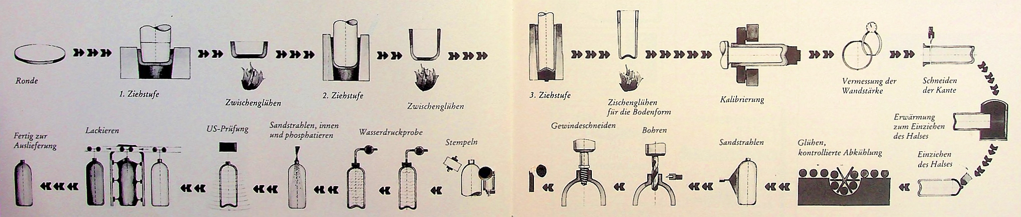 Es gibt grundsätzlich 2 gängige Verfahren zur Herstellung von Stahlflaschen.