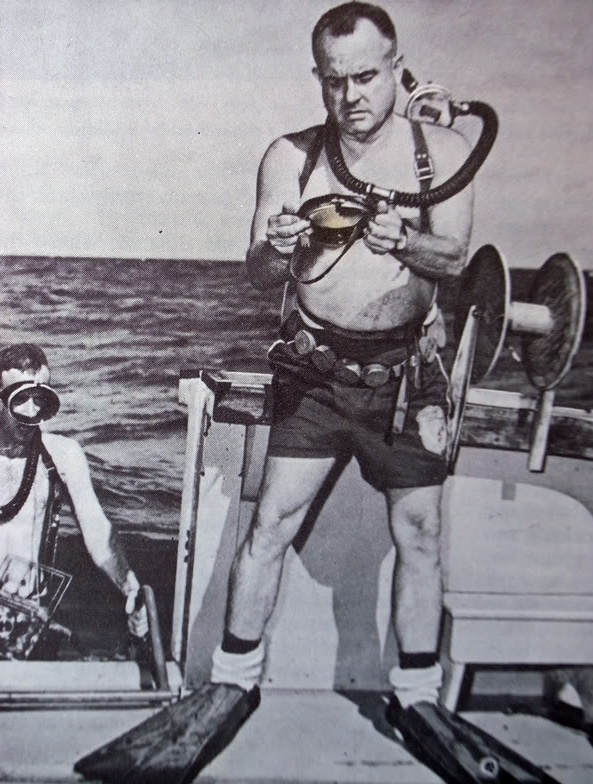 Gummiflossen, Bleigürtel, auf den Rücken geschnallten Flaschen mit Kompaktregler und