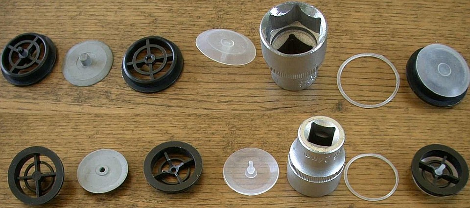 Klick vergrößert!Leider konnte ich keine Ausatemmenbran von einem modernen Regler ausfindig machen, die den richtigen Durchmesser hat, deshalb habe ich einen Ventilteller aus Silikon von einem Cressi-Automaten genommen (Teil-Nr: 746006, 3,60 EUR) und den Außendurchmesser mit einer als Stanze geschliffenen 24er Nuss richtig gestanzt. Dann musste noch ein 3er Loch in den Plastik-Ventilhalter genau zentrisch gebohrt werden (Drehbank) und die innere Höhe bei dem 3er Loch verringert werden, dass der kegelige Zipfel von den Silikonteller aus dem Loch gut herausschnappen kann. Fertig und auf gut schwäbisch: hebt ewig!