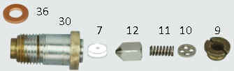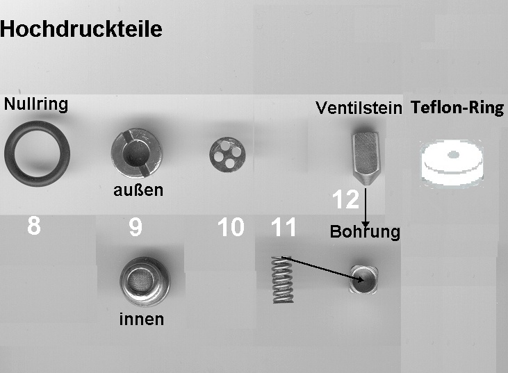 Der keglige Ventilstein dichtet mit einem gelochten Teflon-Ring (Teil 8 im linken Bild), der auf der anderen Seite auf den "alten" Ventilkrater gepresst wird (3 mm dick, Durchm. 9,3 mm, Bohrung 3 mm). Das ist eine ziemlich schlaue Lösung, da am HD-Zapfen so nichts geändert werden muss, der Ventilstein ohne weitere Änderungen  (außer Spiralfeder) ausgetauscht werden, der alte Ventilkrater praktisch kaum mehr verschleißen kann und die Dichtung später relativ einfach auszutauschen ist.