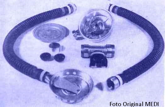 Die Schläuche des Reglers sind am Einatem-Stutzen und am Mundstück auf Schraubstutzen gesteckt und dort im Original mit Bindegarn und ev. etwas Gummikleber gesichert (kann durch Kabelbinder ersetzt werden (s.u.), wenn man kein Nostalgiker ist).