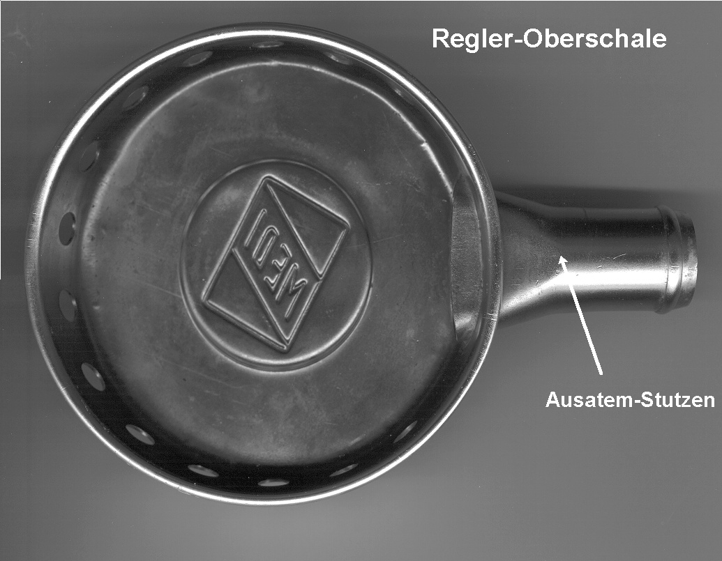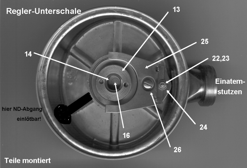 Man kann aber (zur Not) auch nach "Gehör" einstellen. Wenn man den Kammerdeckel hineindreht, steigt der Mitteldruck. Dabei wirkt die Einspannung der Gummimembran wie ein Sicherheitsventil, bei zu hoch eingestelltem Druck "pfeift" der Mitteldruckteil ab. Man dreht einfach soweit wieder heraus, bis keine Luft mehr abblubbert (in Wasser tauchen oder Wasser in die offene Halbschale füllen). Dann gibt man noch eine viertel Drehung zu und hat so einen geeigneten Mitteldruck, wie ich feststellen konnte.