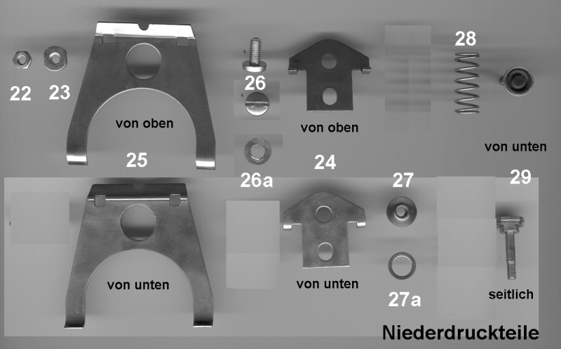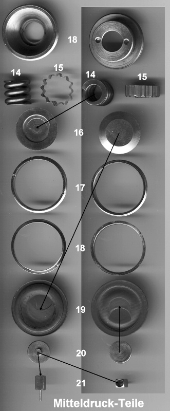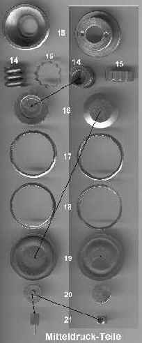 Hochdruckminderer Vom Ventilstein ist im Bild oben die spätere Ganzmetall-Version mit Kegelstumpf abgebildet (Teil 12).