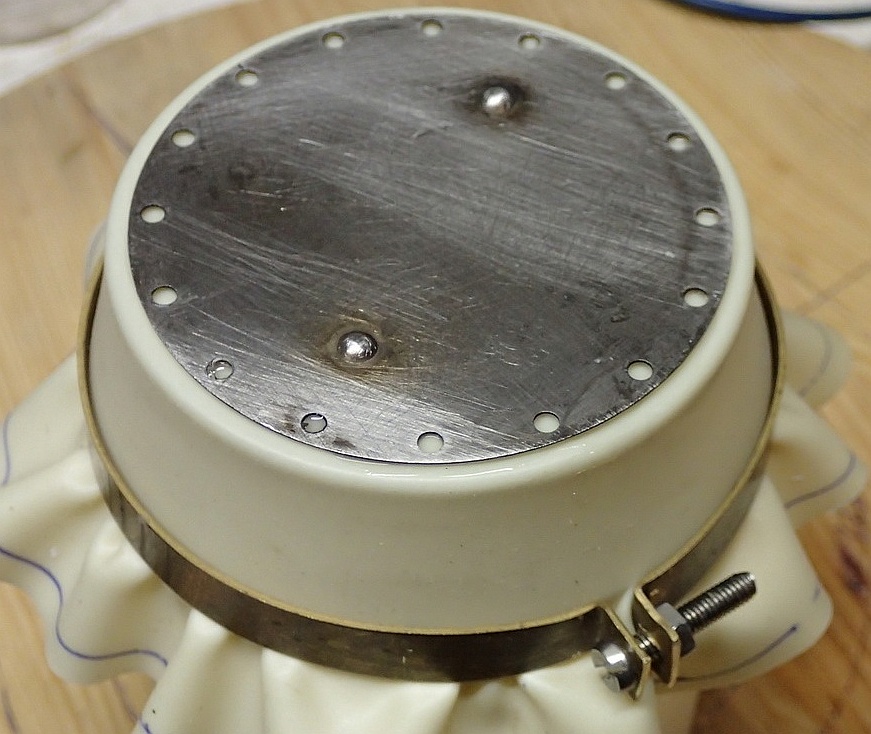 Die beiden Gehäuseschalen (Ms-Blech gedrückt) werden von einem Spannring aus Ms zusammen gehalten, der von einer M5-Schraube gespannt wird.