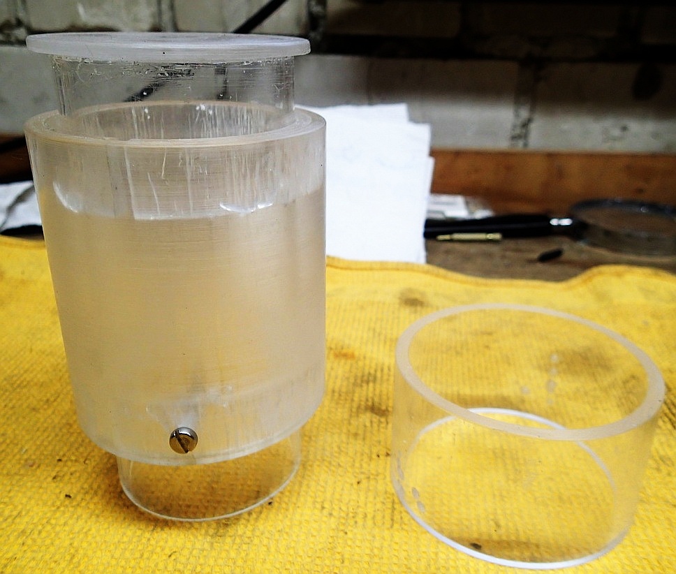 Der Gleitring (18) zwischen HD-Membran und Schraubring (17), der zuerst aus sehr dünnem Blech war (links), wurde durch einen steiferen aus Ms gedrehten Ring ersetzt, der sich nicht so leicht verformen lässt.