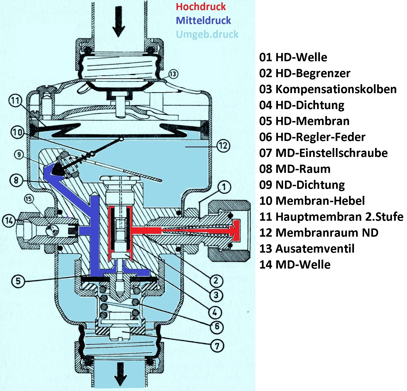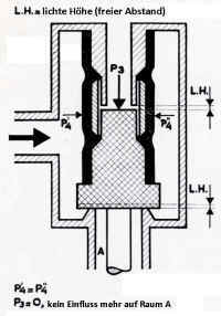 Der Druck in der Hochdruck-Membrankammer, auf den über die Membran der Umgebungsdrucks wirkt, hängt hier nicht vom Mitteldruck ab. Die beiden Regelstufen können trocken bleiben, da der Wasserdruck nur indirekt über die Hauptmembran wirkt, was für die Vereisungssicherheit wichtig ist.