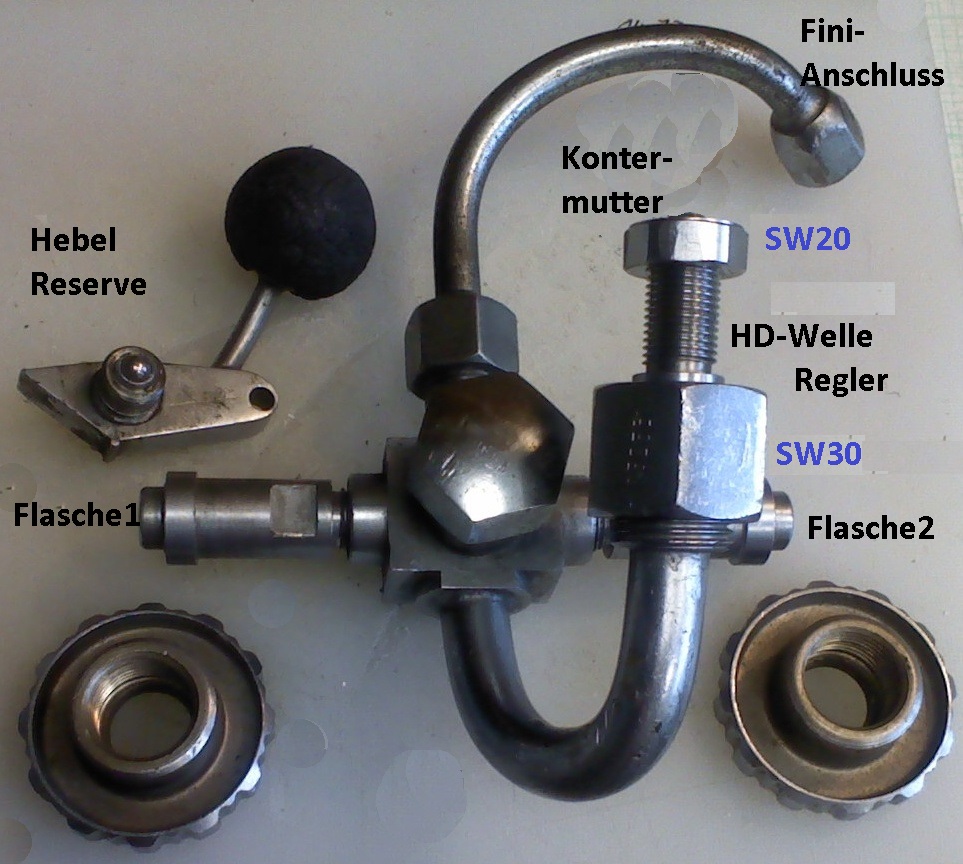 Die Flaschenanschlüsse und auch der HD-Port des Reglers sind weder INT noch DIN (G 1/4") und müssen also für die heutige Nutzung angepasst werden, wobei ich nicht vorhabe, die Brücke einzusetzen, das Fini schon.