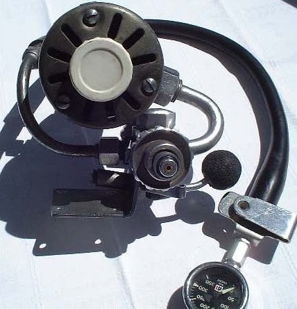 Der Ausatemstutzen fehlt. Er war durch eine Blindkappe aus Plastik verschlossen, was darauf schließen lässt, dass der Regler an einer VGM mit Ausatemventil betrieben wurde wie es bei den Atemgeräten der Feuerwehr (Bild oben) üblich war (Ventile nach unten).