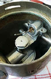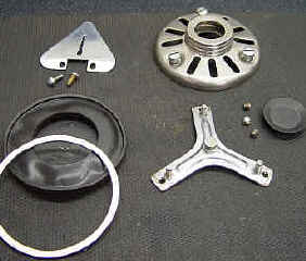 Das folgende Luftleitblech und der Membranhebel lassen sich leicht über je 2 Schlitzschrauben entfernen. Die Dichtung am Fuß des Hebels ist Metall auf Metall, dort sind also keine Probleme zu erwarten, solange sie intakt ist.