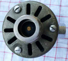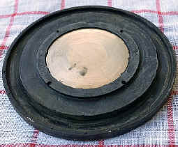 Nach der Entfernung der geschlitzten Ausgangskappe über die 3 Schlitzschrauben sieht man das Ausatem-Scheibenventil, das sich zur Not durch ein Flatterventil vom Dugbill-Eliminator von VDH ersetzen ließe. Den Halter des Ventils kann man leicht entnehmen. Darunter kommt der Ring, der dieSeitenanfang Hauptmembran festklemmt  und dann die Membran.