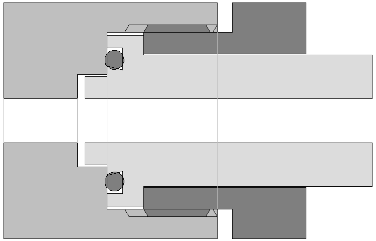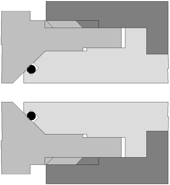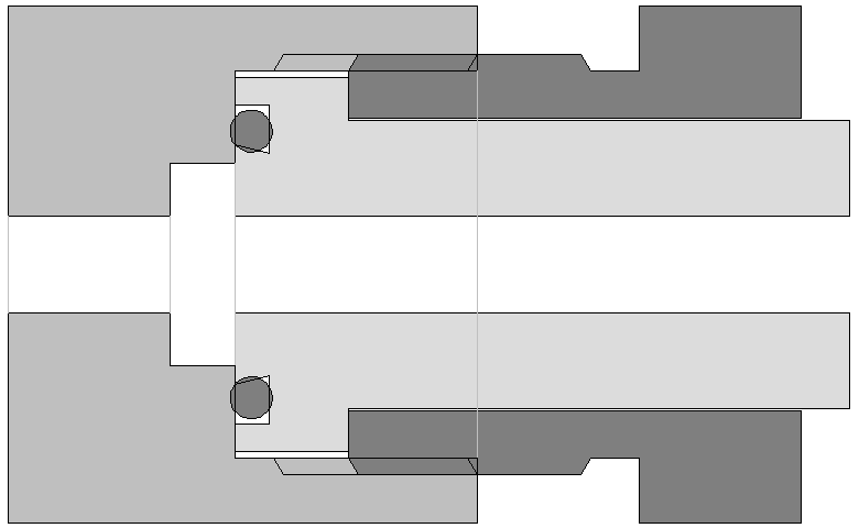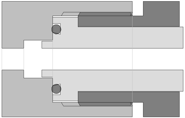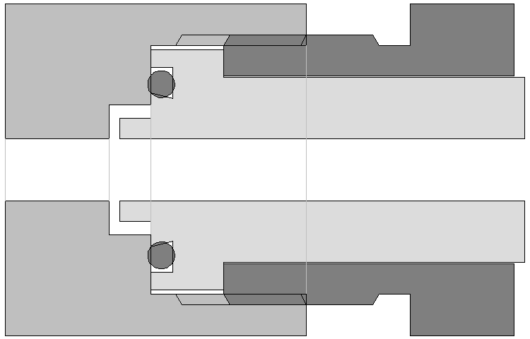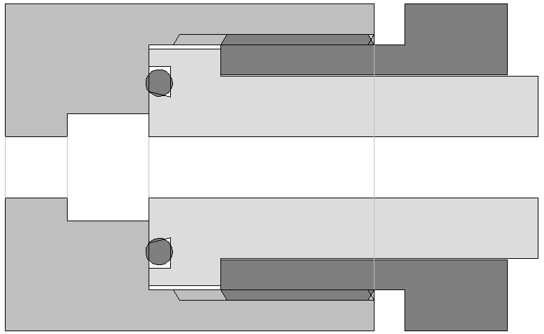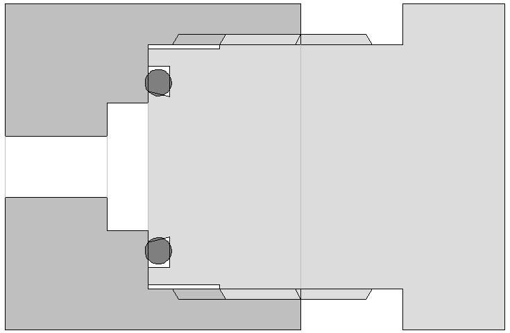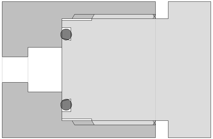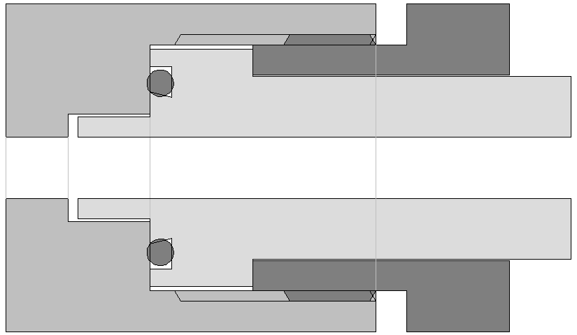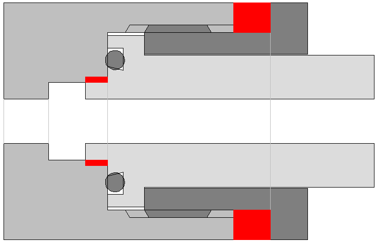 Ein 200-bar-Atemregler passt aber nicht in ein 300-bar-Ventil. Im Bild sind die Stellen, die kollidieren, rot eingezeichnet. Die breite Nase passt nicht in die kleine Bohrung.