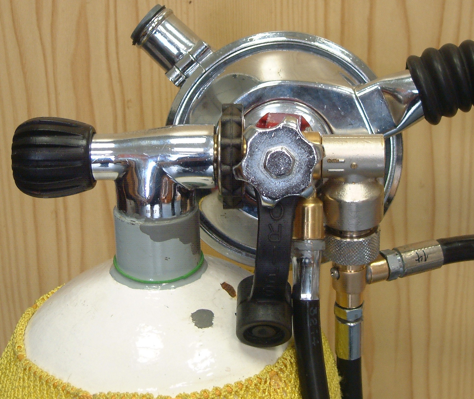 | Wenn man auf die Mitteldruck-Versorgung verzichten kann (z.B. Solo-TG mit Mundtarierung ;-) und man nicht mit Reserveschaltung wie früher tauchen möchte, lässt sich der Hochdruck für das Finimeter über einen Banjo-Adapter, der mit in den INT-Abgang geklemmt wird, abnehmen (oben rechts). | ||