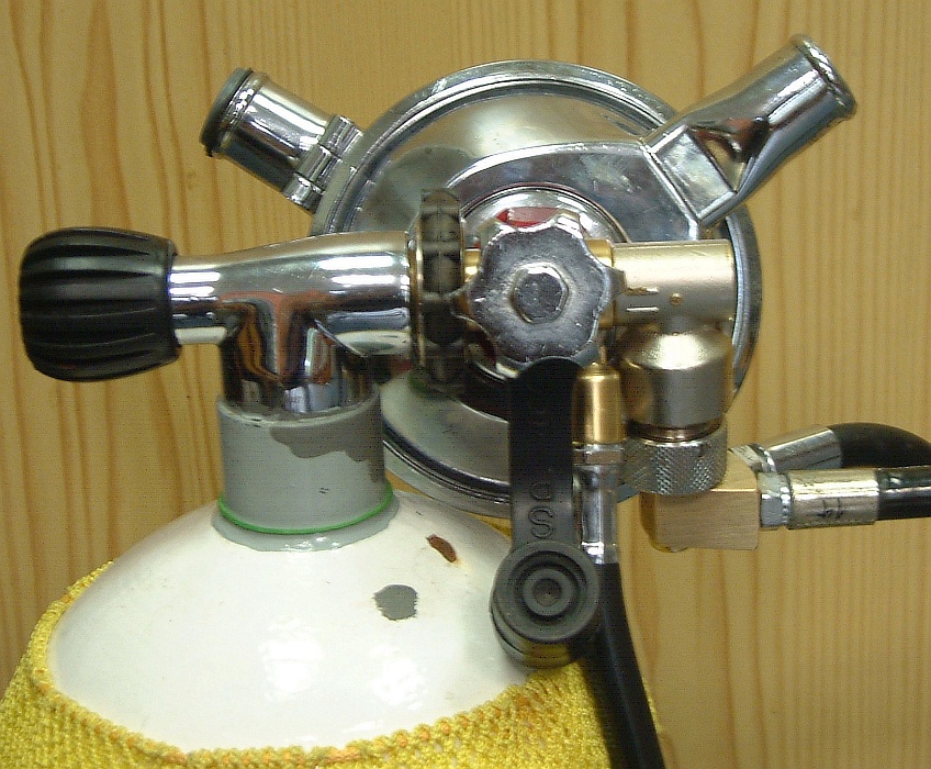 abschrauben, damit der INT-Bügel drüber passt. Dem Flaschenanschluss gegenüber kann ein Miniregler eingeschraubt werden, der MD liefert. Vom Miniregler gegen zwei MD-POrts abwärts. |