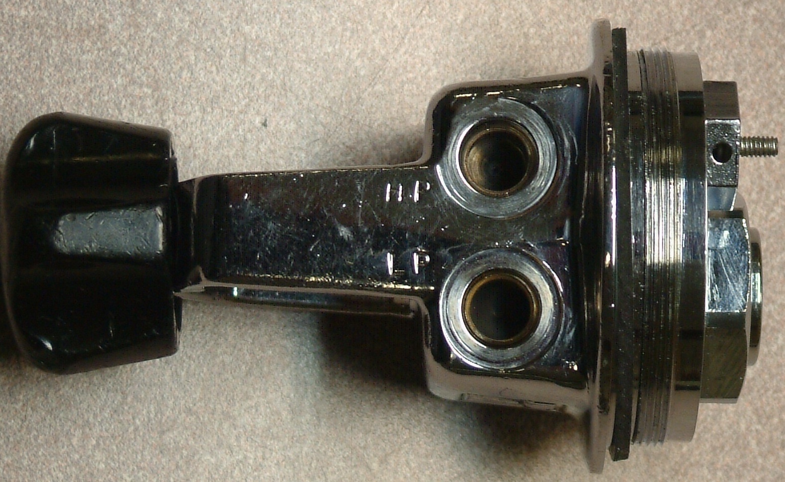 verbinde. Die beiden Ports auf der anderen Seite sind ursprünglich ein HD- und ein MD-Port. Ich hätte dort aber gern zwei MD-Ports für Mundregler und Inflator. Also habe ich die Verbindung des ehemaligen HD-Ports (der beim Trieste auch 3/8"-Gewinde hat) mit einem Stift und Epoxydharz verschlossen und durch eine Querbohrung mit 2,4 mm von außen beide Ports miteinander verbunden. Anschließend wurde das Loch nach außen mit einer M3-Schraube und Epoxydharz verschlossen. Das ist der Senkkopf-M3, den man auf den Fotos sieht. |